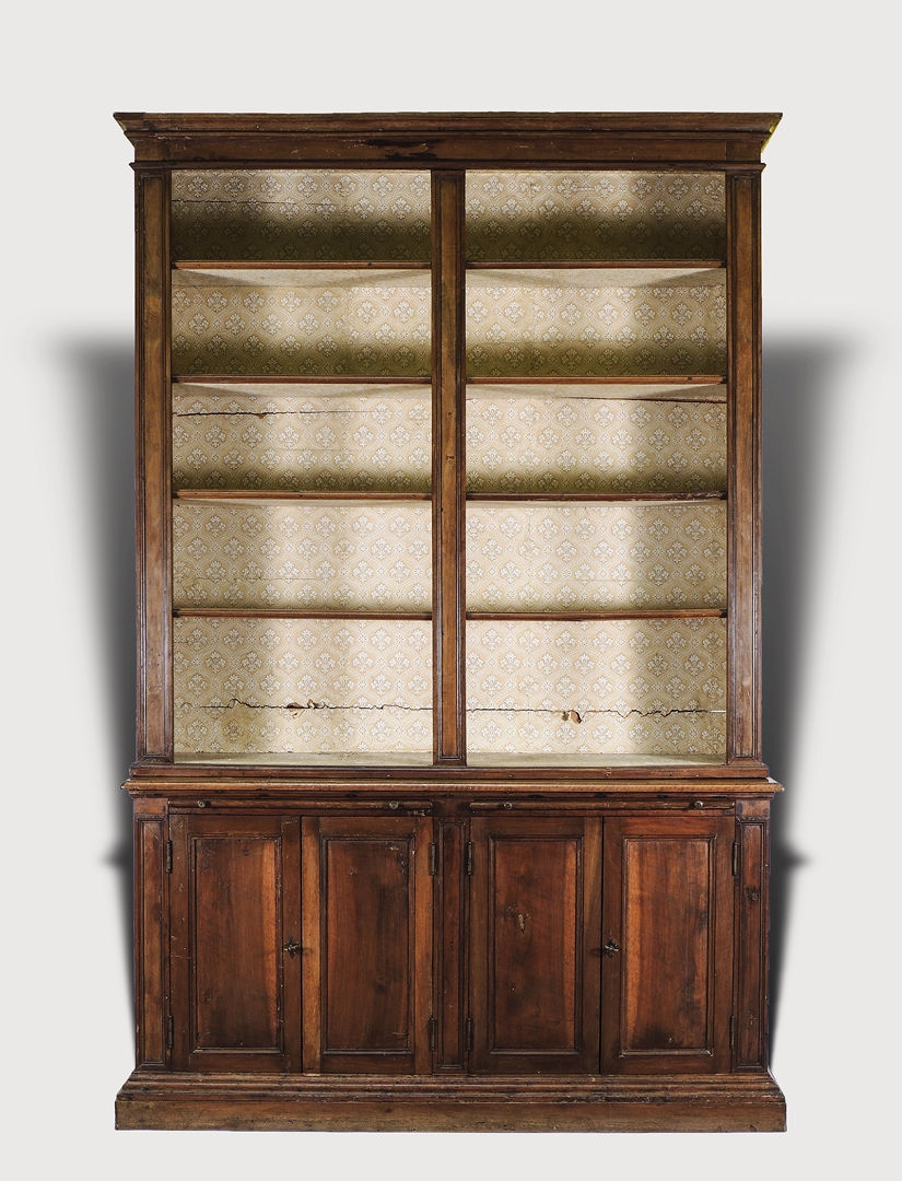 LIBRERIA IN NOCE - WALNUT BOOKCASE dieci ripiani a giorno nella parte superiore con quattro sportelli sottostanti, base a cornice, en pendant con la precedente h cm 246x158x44