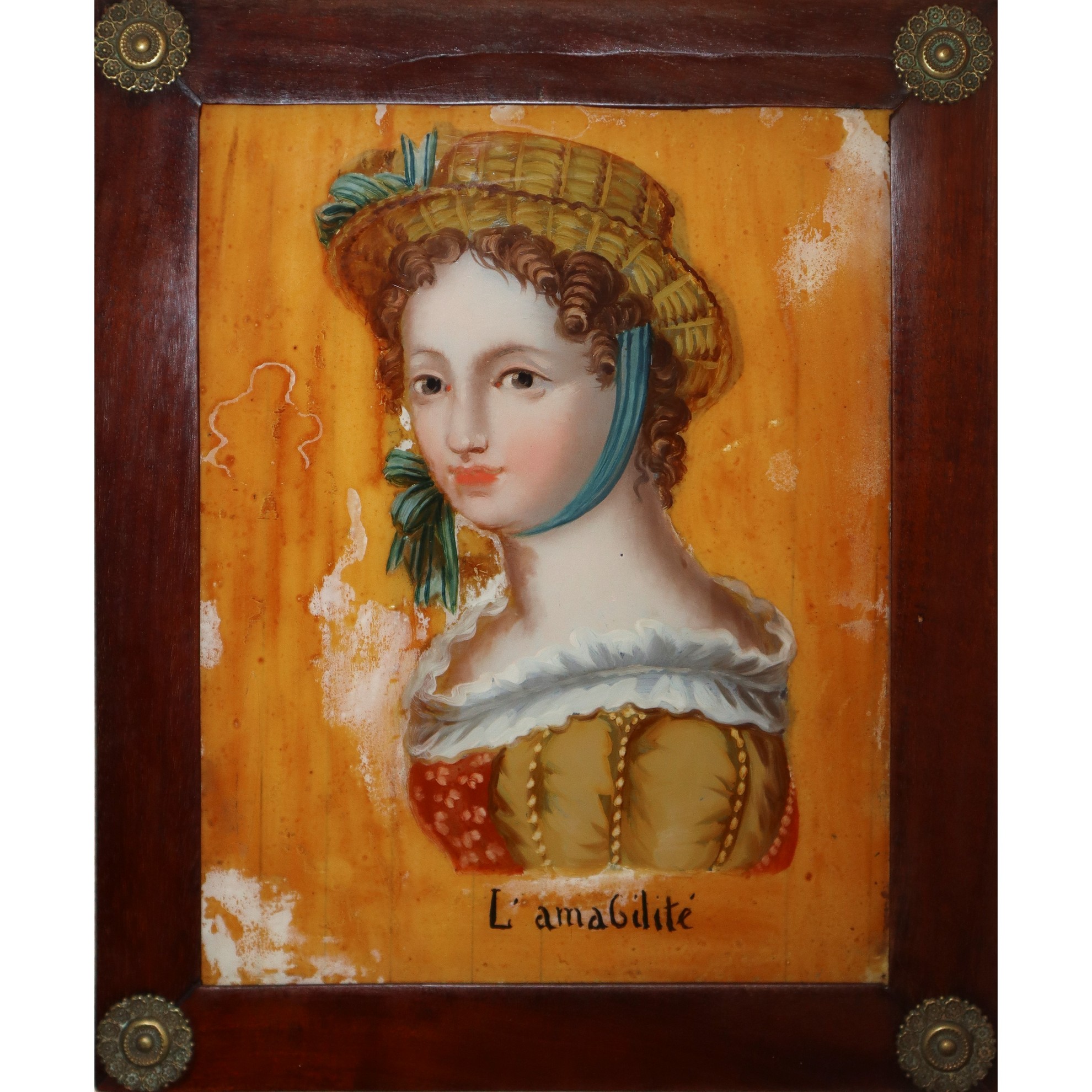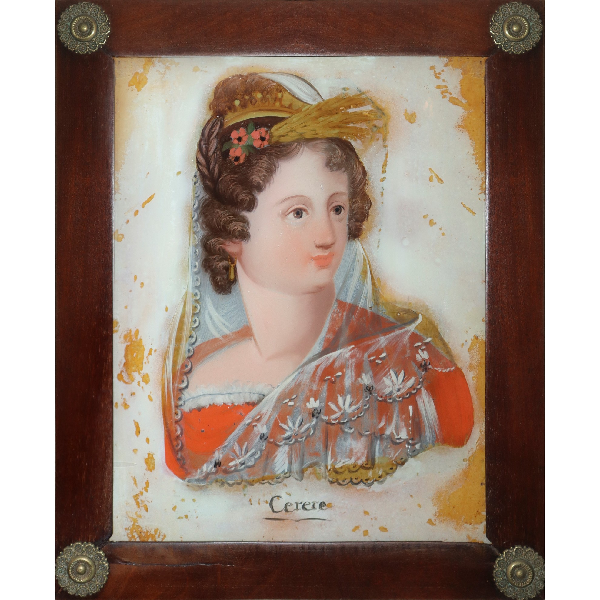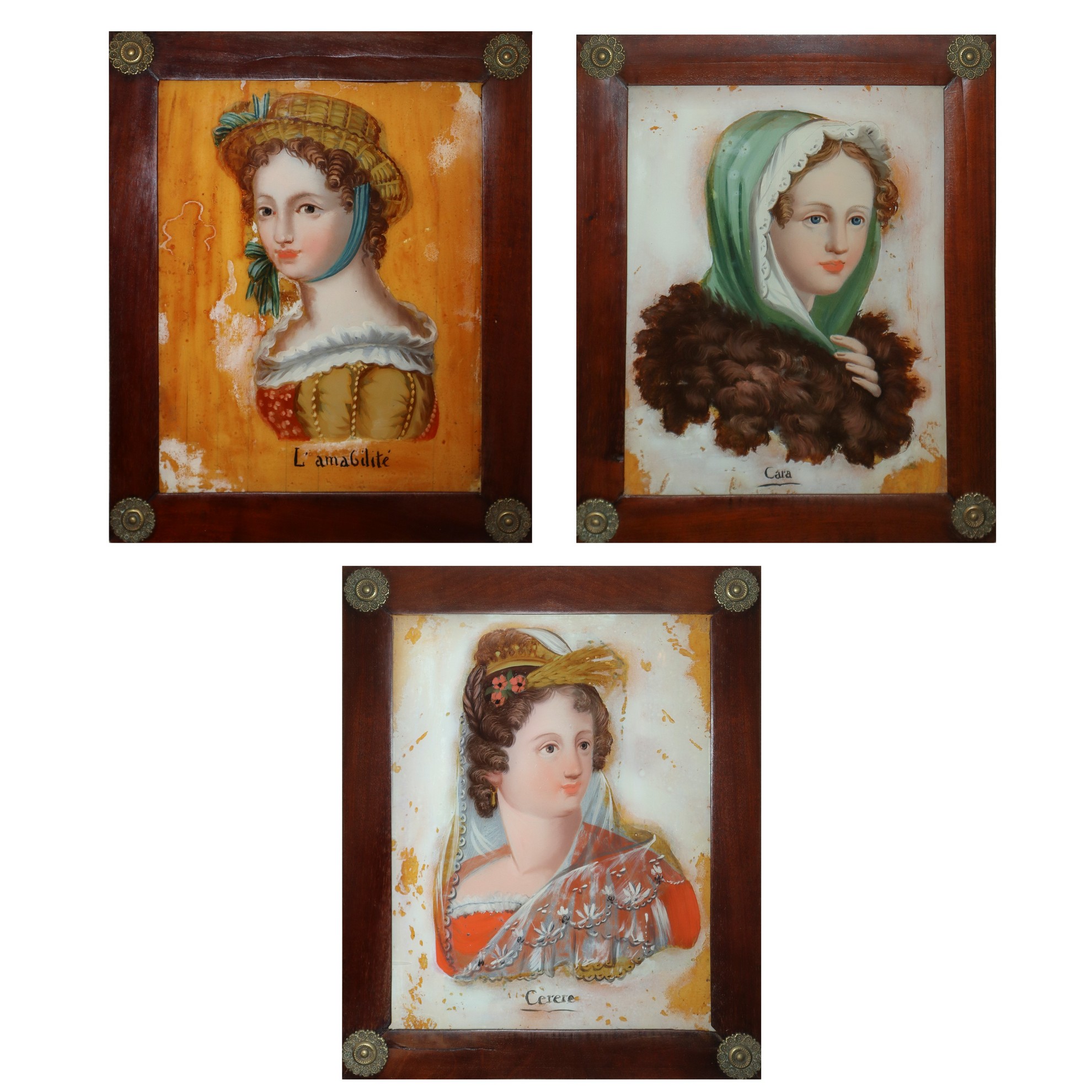 Gruppo di tre dipinti su vetro raffiuranti figure femminili: L'amabilitè, Cara, Cerere.
