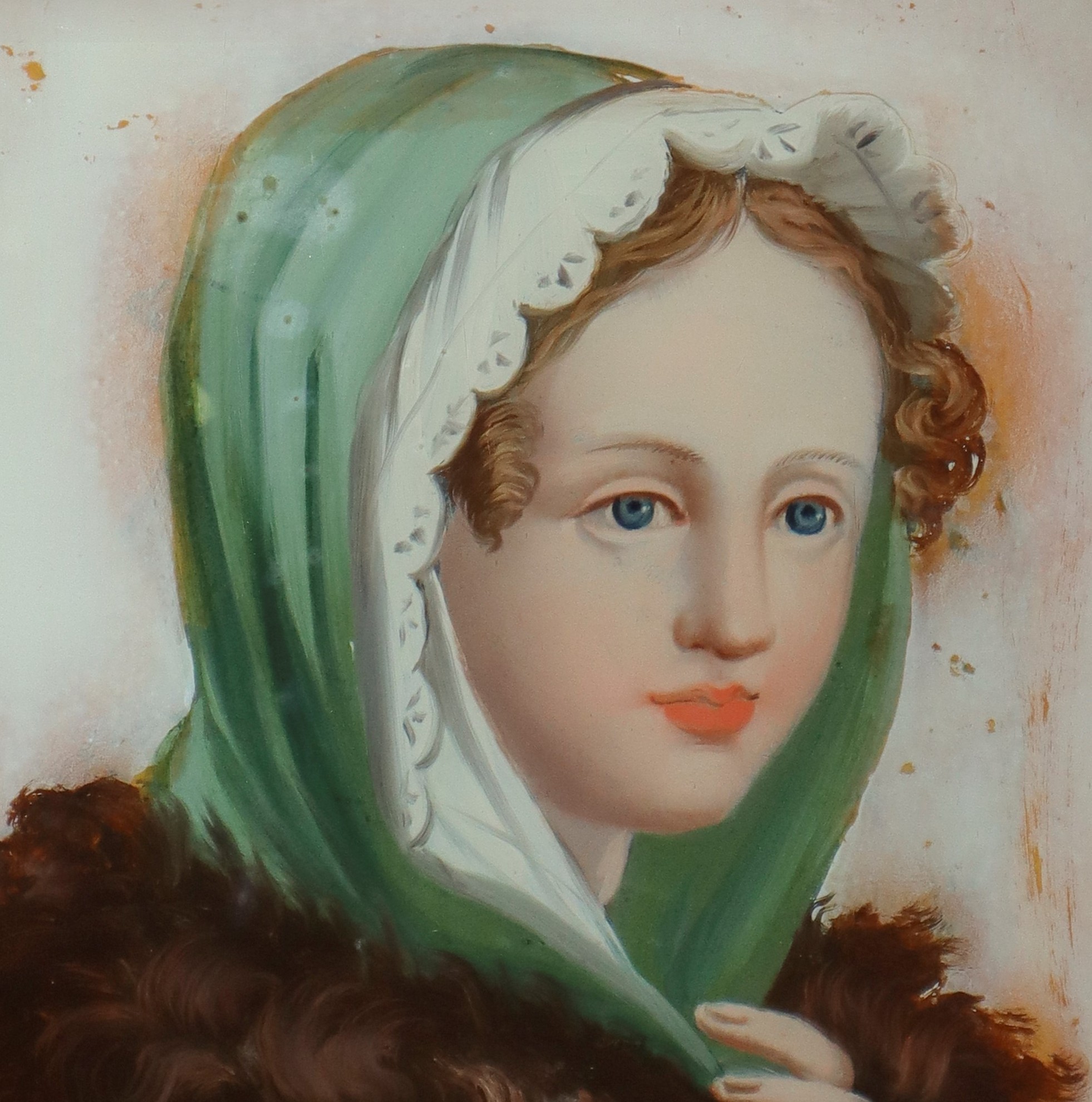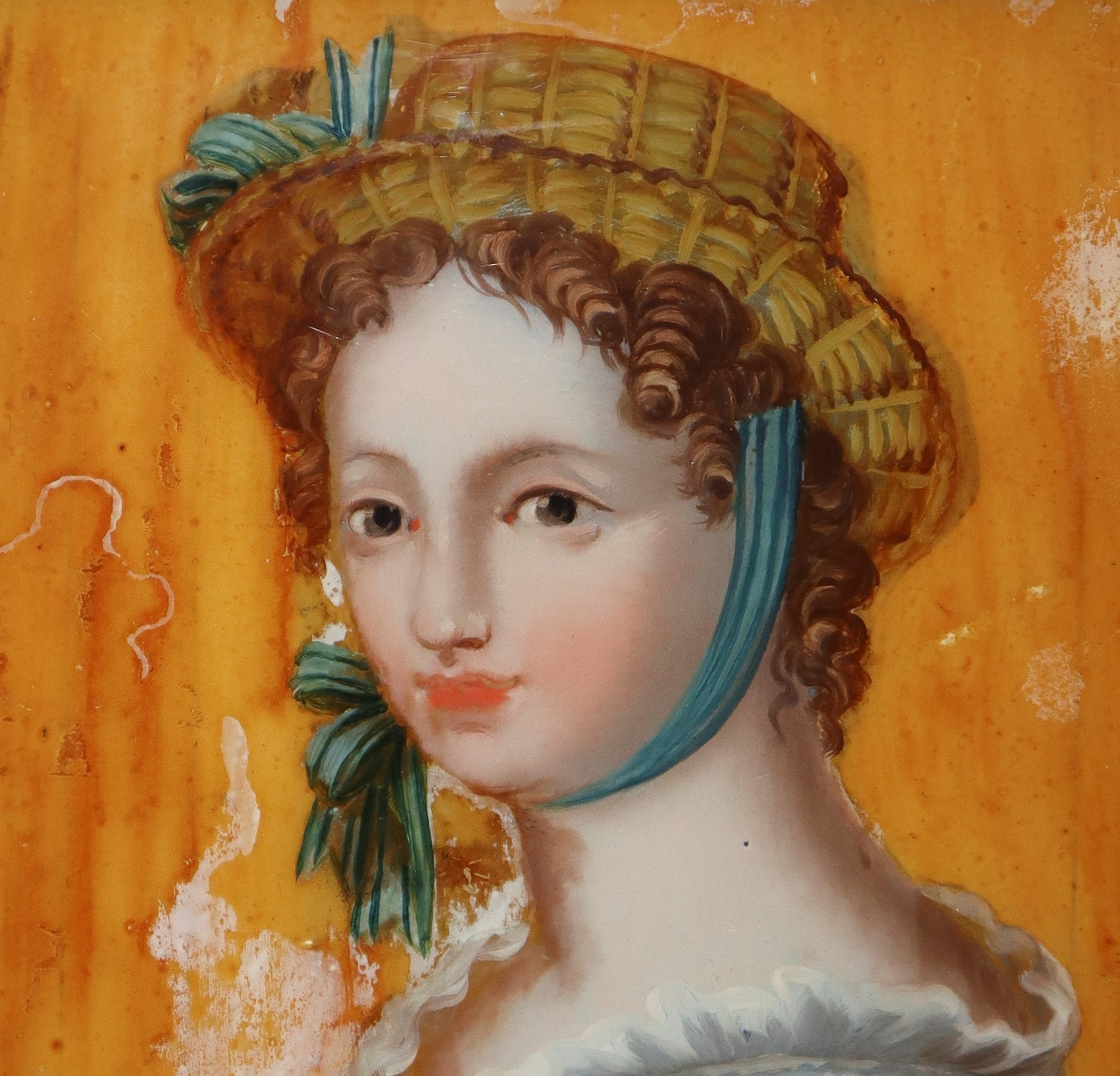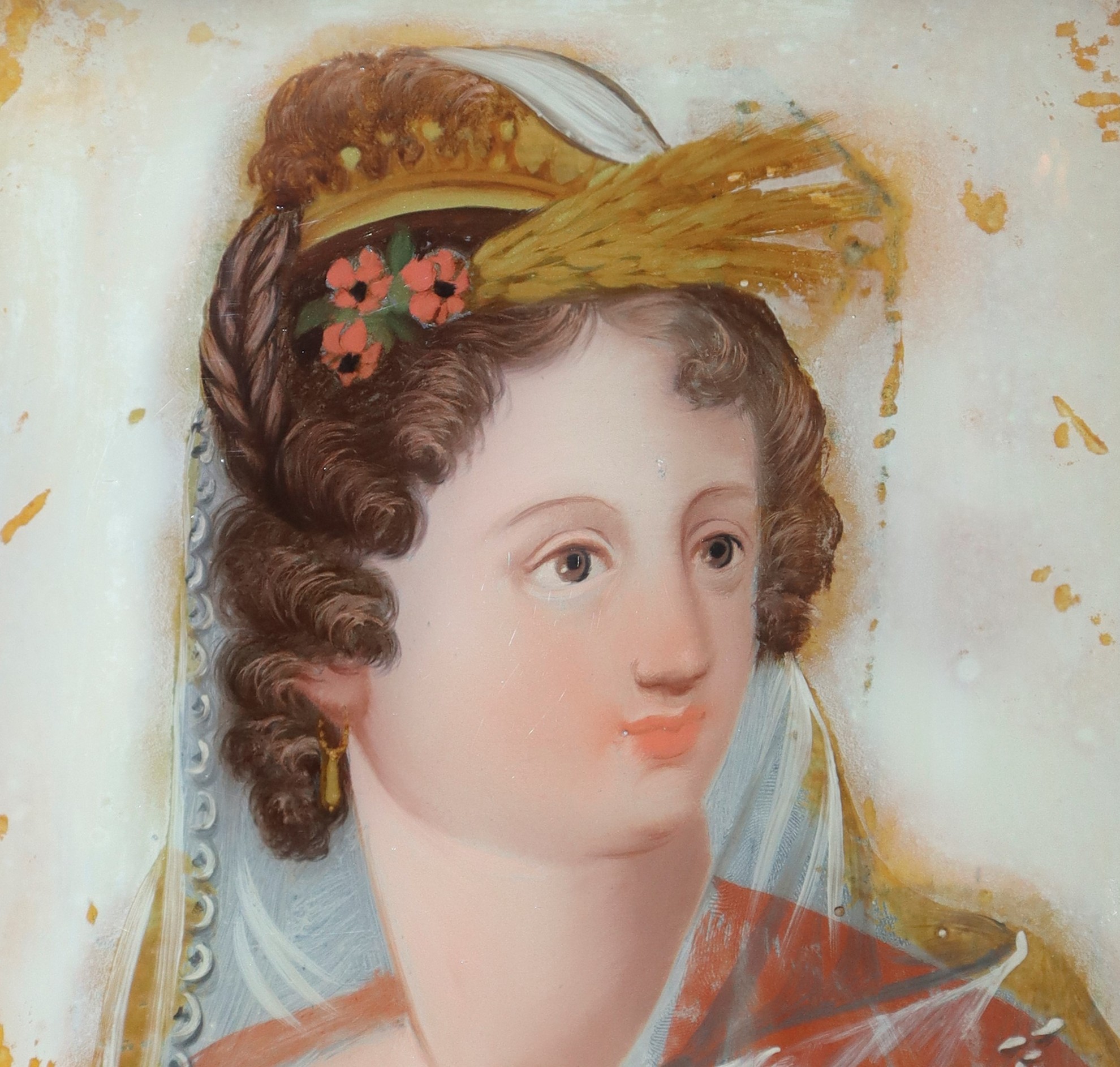 Gruppo di tre dipinti su vetro raffiuranti figure femminili: L'amabilitè, Cara, Cerere.