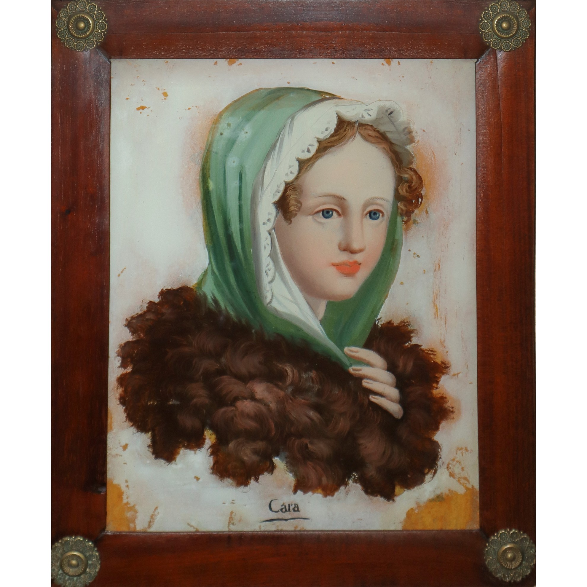 Gruppo di tre dipinti su vetro raffiuranti figure femminili: L'amabilitè, Cara, Cerere. cm 32 x 26