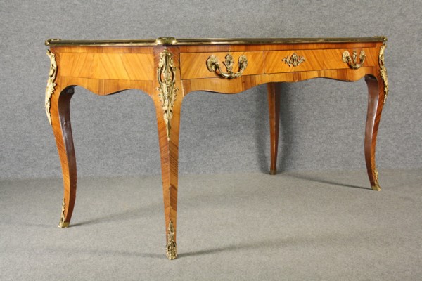 Firmato. Scrivania lastronata in bois de rose e bois de violette con finiture in bronzo, piano sagomato e gambe mosse. Francia. Fine XIX secolo. Mis. Lung. cm. 148 Alt. cm. 76 Prof. cm. 71 ca.