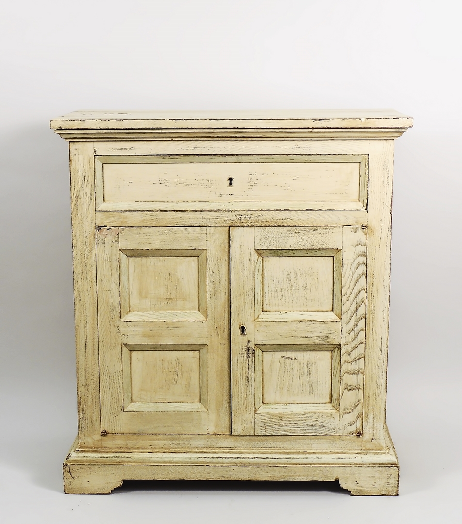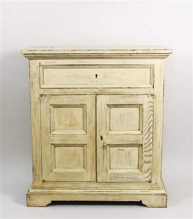 PICCOLA CREDENZA RUSTICA IN LEGNO LACCATO BIANCO - WHITE LACQUERED CUPBOARD sul fronte dritto un cassetto ed uno sportello a due ante, piedi a mensola h cm 79x71,5x33,5