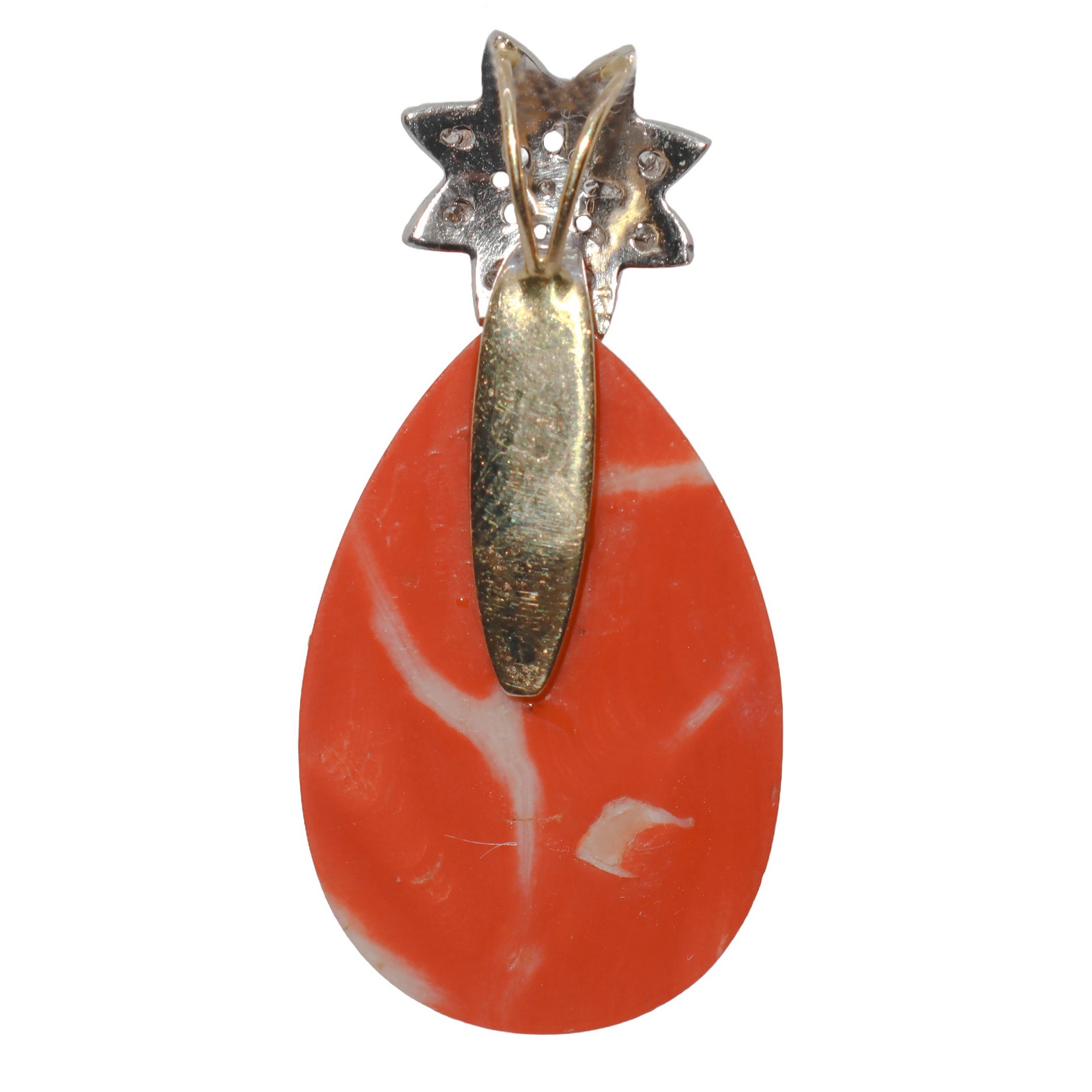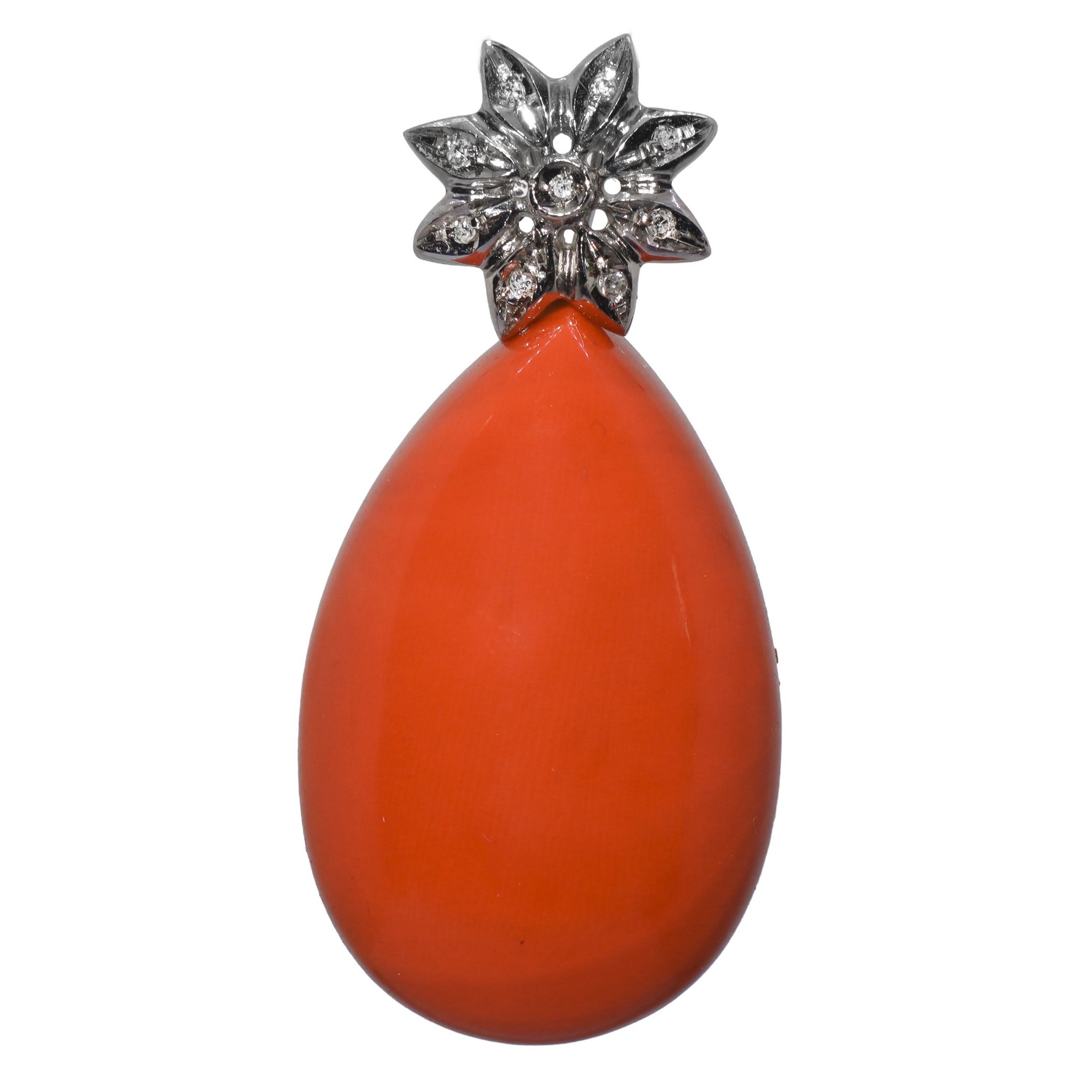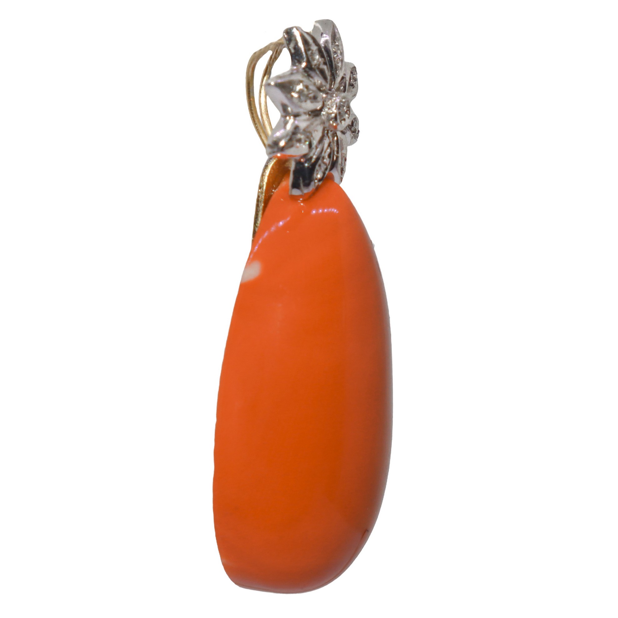 Ciondolo in oro bianco 18kt e brillantini, con corallo a mandorla cm 4, gr 12