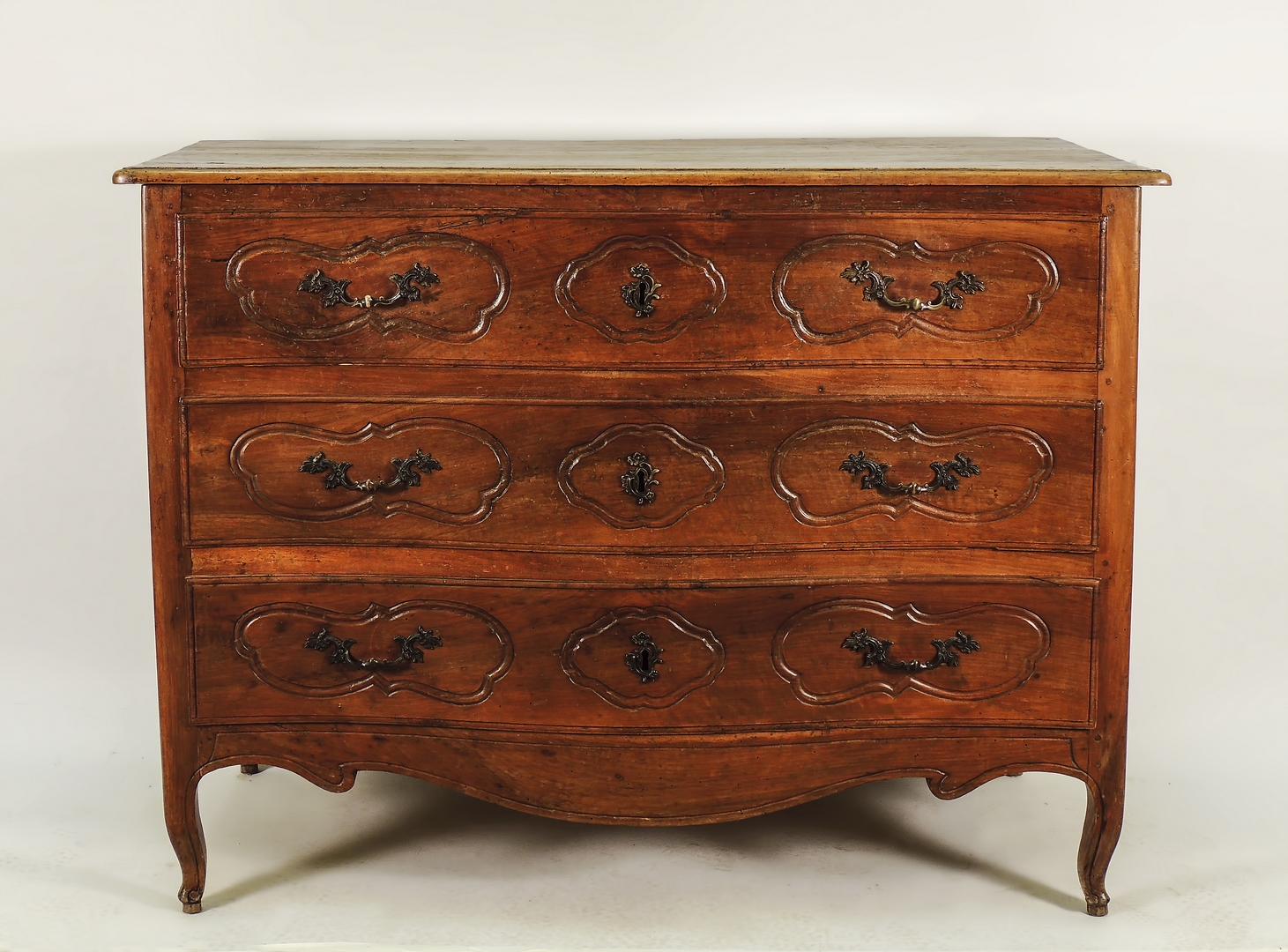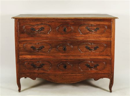 CASSETTONE IN NOCE - WALNUT COMMODE XIX secolo - 19th Century tre cassetti con formelle sagomate sul fronte leggermente mosso, pendaglina mossa, piedi a ricciolo, simile al precedente h cm 99x132,5x58