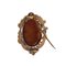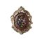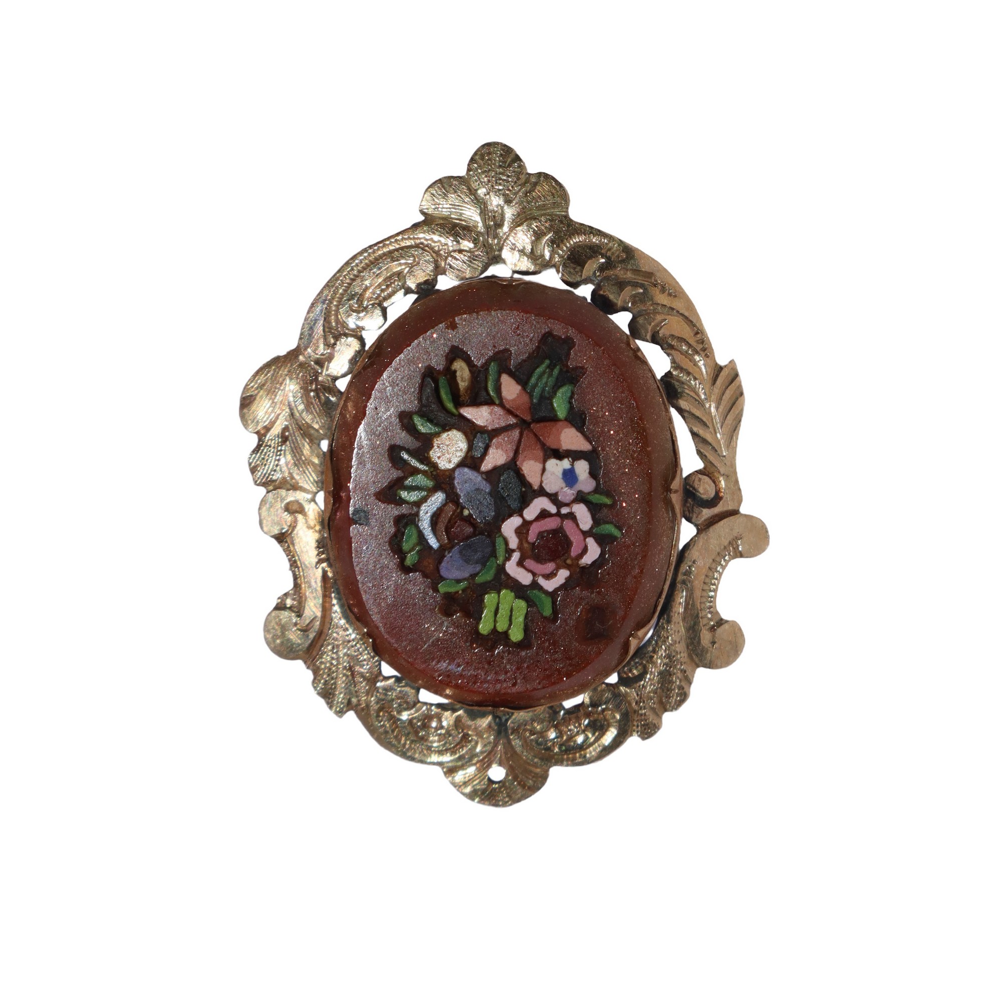 Spilla in oro a basso titolo con commesse di pietre dure a mosaico con motivi floreali.