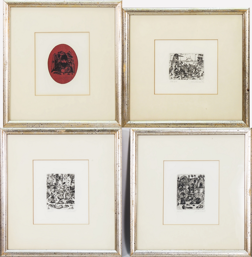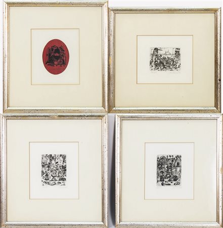 ANTONIO POSSENTI Composizioni - Compositions tre acquaforti su carta ed una stampa su legno - three etchings on paper and one print on panel, firmate, tre numerate, in cornice (4)
