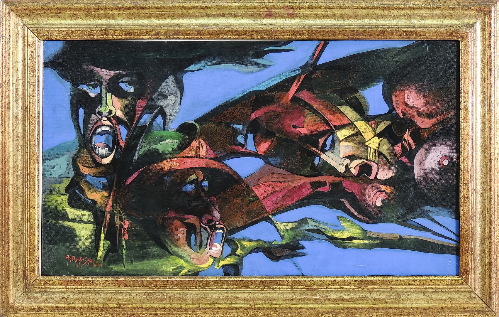 ALFIO RAPISARDI Composizione con figure - Figures oil on canvas - olio su tela, firmato, al verso firmato e dedicato, in cornice, difetto cm 40x70