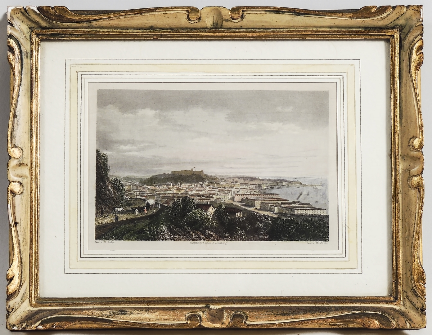 LOTTO - LOT coppia di fermalibri in marmo e piccola incisione con veduta di città in cornice (3)