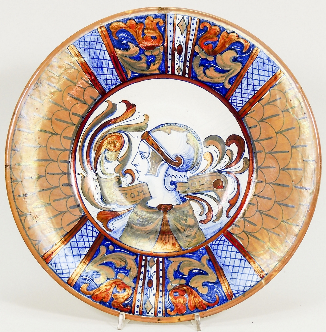 PIATTO DA PARATA IN MAIOLICA POLICROMA - PAINTED MAJOLICA PLATE Gualdo Tadino, inizio del XX secolo - Gualdo Tadino, early 20th Century dipinto in stile Neo-rinascimentale con al centro il profilo di Romolo e cartiglio didascalico diam cm 33,5