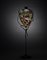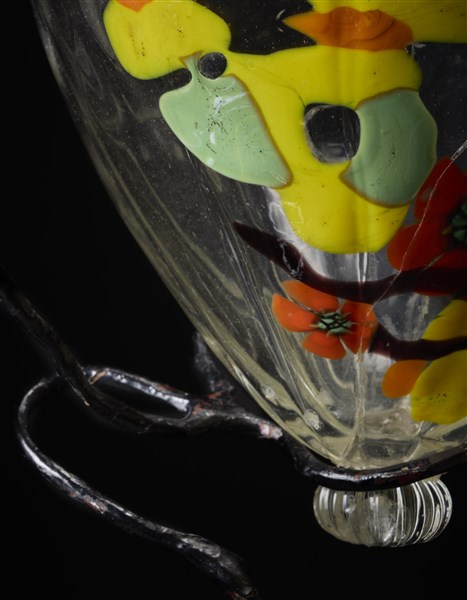 Montatura antropomorfa in ferro battuto raffigurante atlante su piedestallo a doppia calotta in lamina sbalzata con motivi geometrici, braccia alzate diramate in racemi, terminanti in teste di airone. Firmato in pasta "Bellotto" su una tache in vetro nero alla sommità del vaso. (vaso h cm 37, h tot cm 86) (filature al vetro, consolidate mediante restauro conservativo museale documentato)
