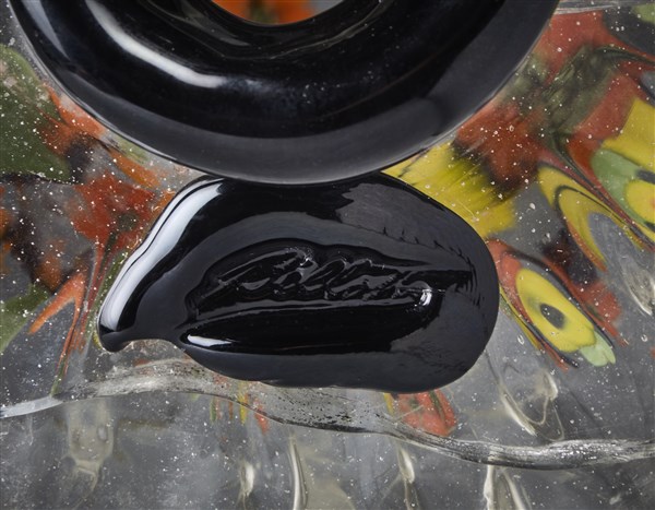 Esecuzione Vetreria Artistica Barovier/Atelier Umberto Bellotto, Murano/Venezia, anni '20. Vaso a forma di grande ampolla in vetro soffiato cristallo con decoro a balloton e costolature verticali. Decoro sul fronte raffigurante frutti, foglie e rami fioriti realizzati con canne e murrine nei colori ametista scuro, arancione trasparente, verde trasparente, celeste trasparente, giallo opaco, rosso opaco, e verde pistacchio opaco. Orlo in vetro nero opaco.