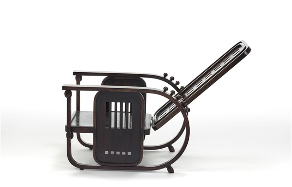 Poltrona modello "669 Morris o Sitzmaschine". Esecuzione Jacob & Josef Kohn, Austria, 1905ca. Faggio curvato al vapore tinto mogano. Bulloneria in ferro. Cuscini rivestiti con tessuto in velluto di lana decorato a motivi geometrici policromi. (cm 83x112x64) (lievi difetti)