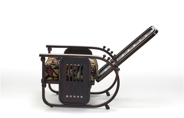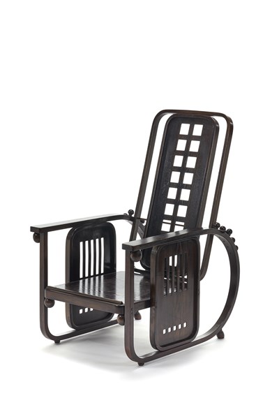 Poltrona modello "669 Morris o Sitzmaschine". Esecuzione Jacob & Josef Kohn, Austria, 1905ca. Faggio curvato al vapore tinto mogano. Bulloneria in ferro. Cuscini rivestiti con tessuto in velluto di lana decorato a motivi geometrici policromi. (cm 83x112x64) (lievi difetti)