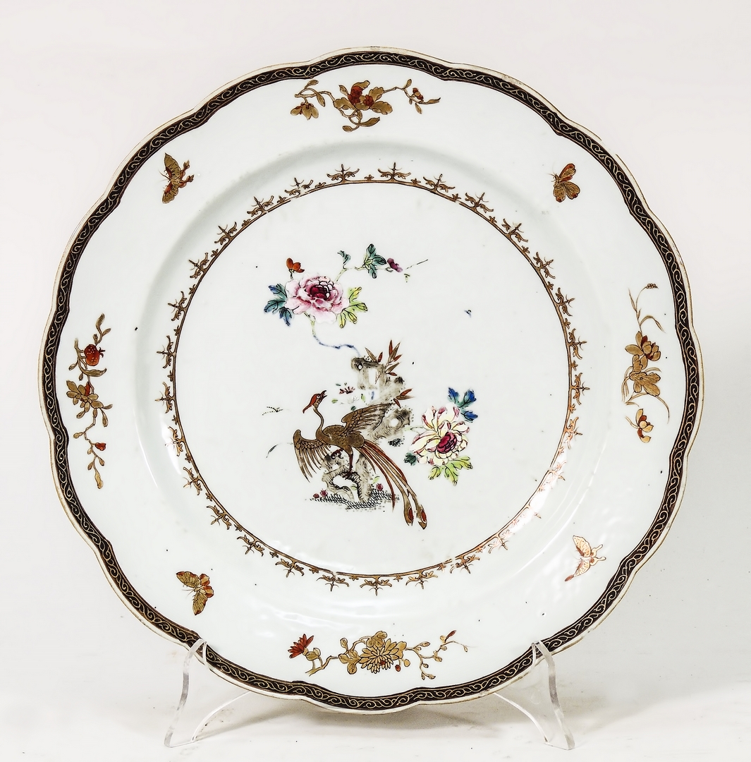 PIATTO IN PORCELLANA POLICROMA - PAINTED PORCELAIN PLATE Compagnia delle Indie - East India Company dipinto con fenice e motivi floreali diam cm 32