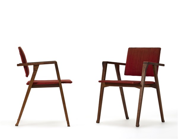 Coppia di sedie modello "PT1 Luisa". Produzione Poggi, Pavia, 1950-1955. Legno massello con rivestimento in tessuto rosso. Premio "Compasso d'oro" 1955. (cm 55x77x55) (lievi difetti, piccole mancanze e modifiche )