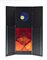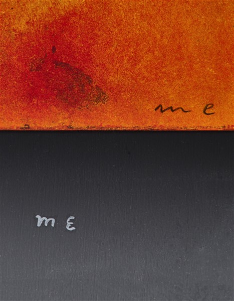 Screen model "Il grande ignorante". Produced by Mirabili, Florence, 1974ca. Three wooden panels decorated with mixed media and lithography. Monogram 'me' on lithograph lower right and 'ME' on central panel. (164x184 cm.) (slight defects)
