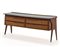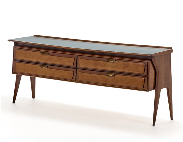 Sideboard a quattro cassetti. Cantù, 1950ca. Legno massello e impiallacciato. Pannelli impiallacciati a spina di pesce.