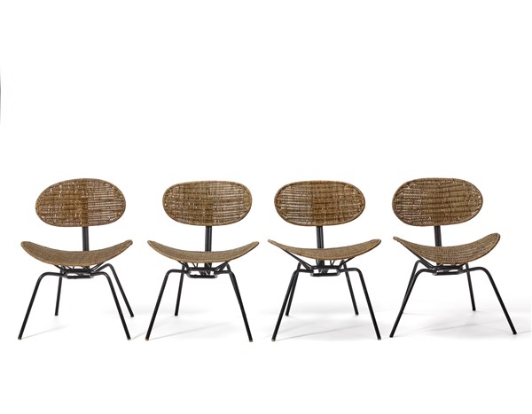 Quattro sedie modello "Farfalla" della serie "Monofilo". Commercializzazione Emilio Paoli, Firenze, 1953ca. Tubi di ferro verniciato nero e rattan. Recanti fascia metallica del produttore. Segnalazione al Compasso d'oro del 1956. (cm 58x73x52) (difetti)