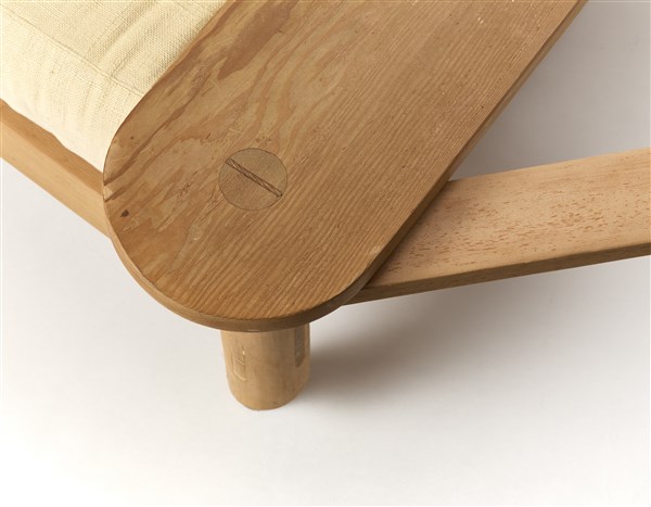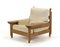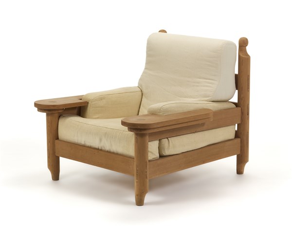 Poltrona con vassoi girevoli integrati nel bracciolo. 1965. Legno di faggio massello, cuscini imbottiti rivestiti con tessuto bianco. (cm 100x87,5x107,5) (lievi difetti)