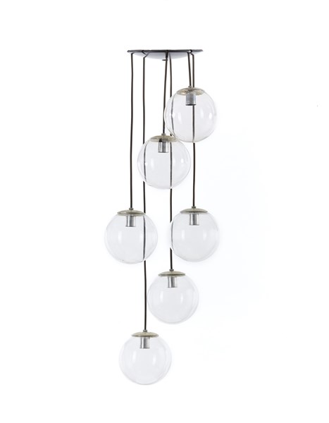 Suspension lamp model "2095/6". Produced by Arteluce, Milan, 1960. Rosette in black painted metal, spheres in clear glass. (variable dimensions. max h cm 160. reflectors d cm 20)