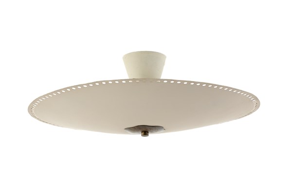 Suspension lamp model "3011". Produced by Arteluce, Milan, 1938-42. Flat reflector in white lacquered aluminium, perforated along the edge. Brass ceiling rose. (h 26 cm.; d 70 cm.) (slight defects)