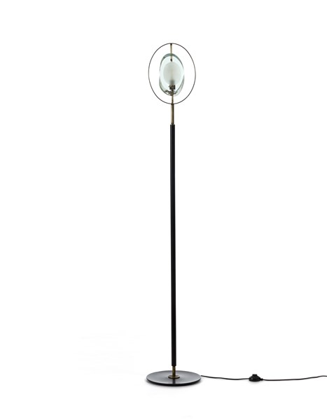Ground lamp model "2020". Produced by Fontana Arte, Milan, 1961ca. Black lacquered metal frame with brass parts, pair of grindstone-shaped crystals with opaque excavation. (h 170 cm.) (slight defects)