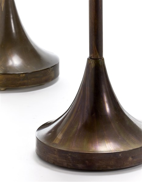 Coppia di lampade da terra. Esecuzione Pierino Frigerio, Cantù, 1970. Base a tromba e fusto in ottone brunito e verniciato trasparente, paralume in stoffa. (h cm 177)