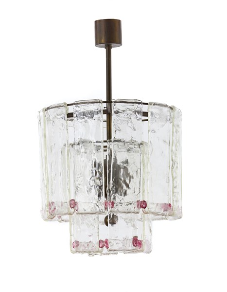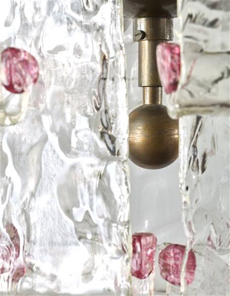 Suspension lamp. Pierino Frigerio (Cantù) e Manifattura di Murano,, 1970. Stem structure, rings and sphere in burnished and transparent painted brass, two orders of large pendants in corrugated colorless transparent glass with light amethyst glass inserts. (d 58 cm.) ()