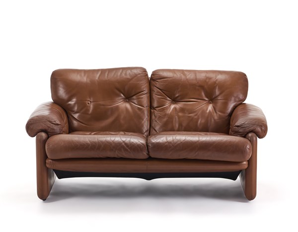 Divano a due posti modello "Coronado". Produzione B&B, Italia, 1966. Rivestimento in pelle marrone. Recante etichetta della produzione sotto la seduta. (cm 152x74x90)