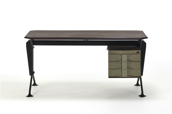 Scrivania con cassettiera a tre cassetti della serie "Arco". Produzione Olivetti Arredamenti Metallici, Ivrea, anni '50. Metallo verniciato nero, piano in legno, cassetti in plastica grigia. (cm 160x76,5x80) (piccole manomissioni e lievi difetti)
