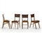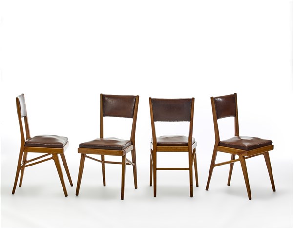 Lotto di quattro sedie con struttura in legno e seduta marrone. Italia, anni '4