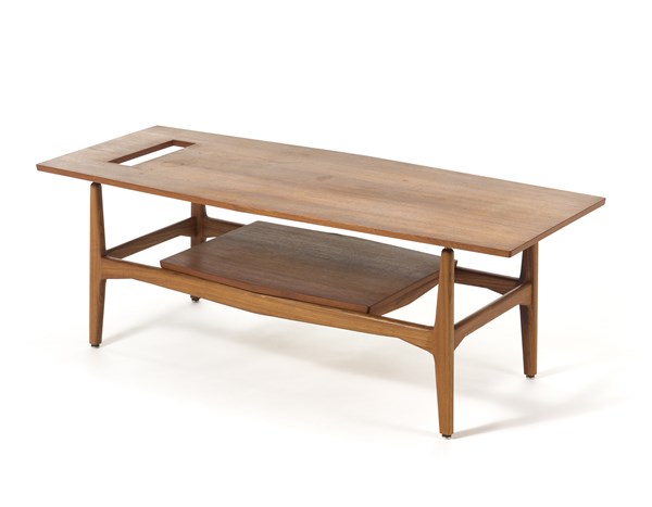 Tavolino da salotto modello "Poker". Besnate, 1959. Legno massello e impiallacciato. (cm 149x50x62,5) (lievi difetti)