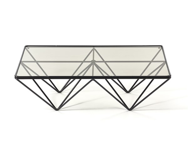 Tavolino modello "Alanda". Produzione B&B, Italia, 1982. Struttura in acciaio a piramidi rovesciate color nero lucido, piano in vetro. (cm 100x30x54) (lievi difetti)