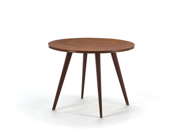 Tavolo in legno massello e impiallacciato, con piano circolare e quattro gambe