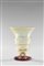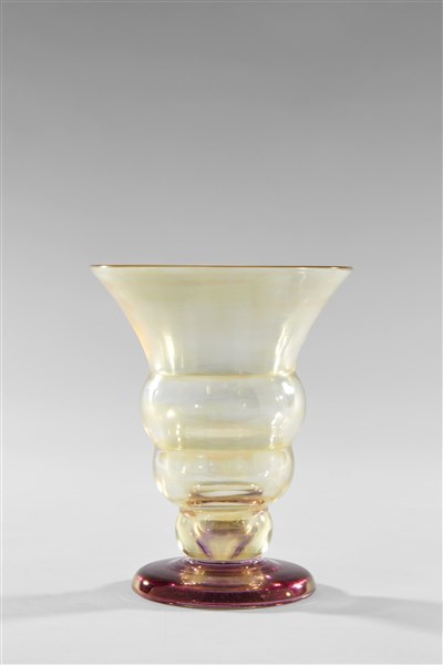 Vaso Art Déco in vetro trasparente ambrato, base in vetro trasparente ametista, superficie iridata. New York, 1925ca. Firmato a punta sotto la base. (h cm 14,5; d cm 12)