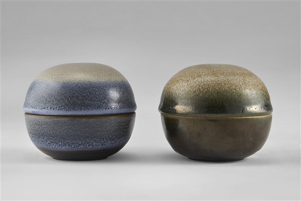 Coppia di scatoline in terracotta smaltata rispettivamente nei toni del blu/celeste e del verde/bruno. Manifattura Ceramiche Arcore, Italia, anni '70. Monogrammato "CA" sotto la base. (h cm 8) (difetti)