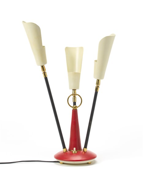 Lampada da tavolo a tre luci. Milano, anni '50/'60. Metallo laccato rosso, bianco e nero, minuterie in ottone. Etichetta del produttore alla base. (h cm 47) (lievi difetti)