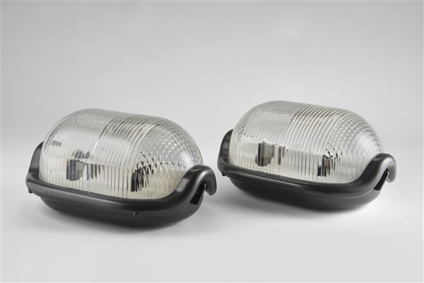 Group of two ground lamps model "Noce". Produced by Flos, Milan, 1972. White painted aluminium, molded glass lid. Marked under the base. (36.5x20x26 cm.)