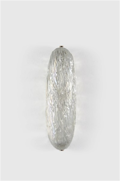 Lampada da parete. Esecuzione Venini, Murano, anni '50. Vetro iridescente con finitura superficiale a "corteccia". (cm 11x44x12)