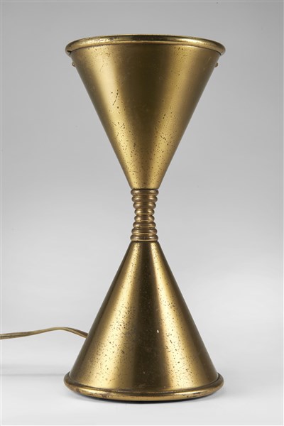 Lampada da tavolo a forma di clessidra in ottone e vetro sabbiato. Italia, anni '50. (h cm 25; d cm 11,5) (difetti)