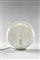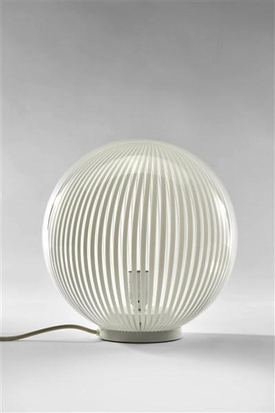 Lampada da tavolo della serie "Tessuti". Esecuzione Venini, Murano, 1982. Vetro soffiato a canne lattimo e cristallo. Base in alluminio laccato bianco. (h cm 29)