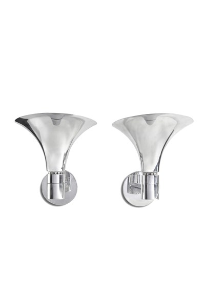 Due lampade da parete della serie "AM/AS". Produzione Sirrah, Imola, anni '60/'70. Metallo cromato. (cm 28x31x44) (difetti)