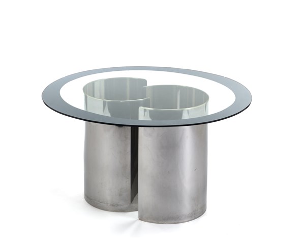 Tavolo alto modello "Fascia specchiata". Produzione Azucena, Milano, anni '70. Piano ovale in cristallo con fascia perimetrale specchiata, due sostegni a "C" in metallo. (h cm 71; d cm 140) (lievi difetti e piccole mancanze)