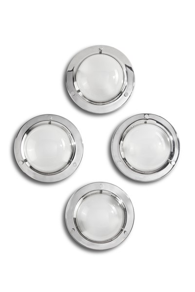 Quattro plafoniere-appliques modello "LSP6 Tommy". Produzione Azucena, Milano, 1965. Struttura in acciaio lucidato, paralume in vetro smerigliato internamente. (d cm 35,5) (lievi difetti)