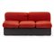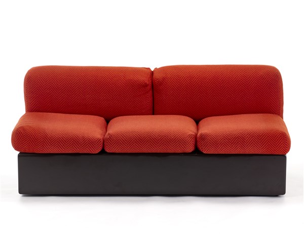 Divano letto a due posti. Produzione Azucena, Milano, anni '70/'80. Legno laccato marrone, cuscini rivestiti in lana rossa ad effetto spigato. (cm 180x70x87) (difetti)