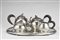 Tea and coffee service consisting of teapot, coffee pot, milk jug, sugar bowl and tray with mirrored bottom, lid handles in the shape of bone fruits. Alexandria, 1930s. Hammered silver. 800 silver, marked under the bases. (g 1880 lordi) (misure diverse) (defects, non coeval neck)