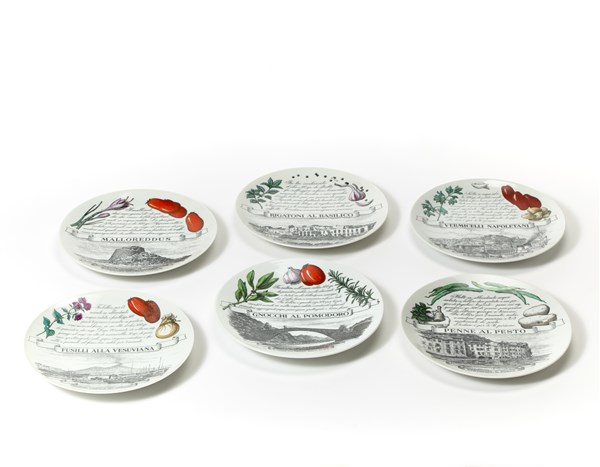Piero Fornasetti Gruppo di sei piatti della serie "Piatti tipici regionali". Mil