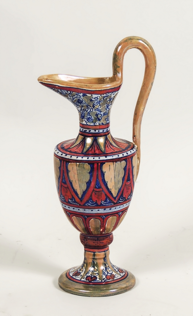 VERSATOIO IN MAIOLICA POLICROMA - PAINTED MAJOLICA JUG Gualdo Tadino, inizio del XX secolo - Gualdo Tadino, early 20th Century corpo a ogiva su base circolare, manico mosso, dipinto nei toni del blu, rosso e oro h cm 32
