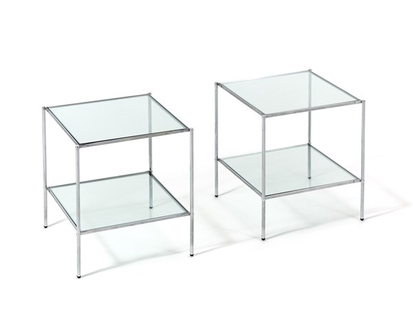 Coppia di tavolini a due ripiani modello "T12 Montecarlo". Produzione Azucena, Milano, 1959. Ottone nichelato con ripiani cristallo. (cm 42x46x42)