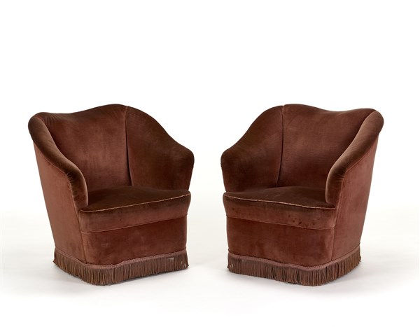 Coppia di poltroncine di forma mossa. Produzione Casa e Giardino, Milano, anni '40. Rivestimento in velluto color vinaccia. (cm 69x70x68) (difetti)